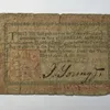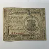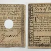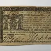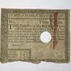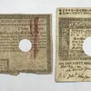 Two early American Banknotes. Continental, Massachusetts 1780 Three Dollar Note, Printed by Hall & Sellers. Approximately 9.2cm x 7cm. Condition, creases, staining. Discontinued Hole to right of centr…