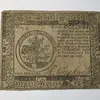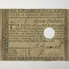 Continental, Massachusetts 1780 Seven Dollar Note, Printed by Hall & Sellers. Approximately 9.2cm x 7cm. Condition, creases, staining. Discontinued Hole to right of centre.