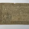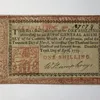 Philadelphia 1777 One Shilling Note, Printed by John Dunlap in black & red, Approximately 10cm x 6cm. Condition, creases, staining.