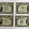 Collection of American $10 Banknotes of 1928 Gold Certificate, 1934-A Silver Certificate (yellow seal), 1934 Cleveland (green seal)and a 1953 Silver Certificate (blue seal).