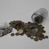 One jar of foreign coins including bag of Spanish coins with dates 1940-1945. Ten Diez cents etc