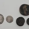 7 Coins dating from Roman to Milled. including Four Roman Bronze/Copper alloy coins with Silver Georgian Halfcrown and Shilling and a Silver French Napoleon III one franc.