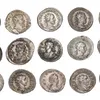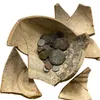 A GROUP OF ROMAN ANCIENT BRONZE COINS DISCOVERED WITHIN A ROMANO-BRITISH POTTERY VESSEL the vessel of coarse buff fabric with thickened rounded rim, broken but substantially present. The coins largely…