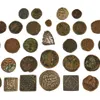 Collection of Roman, Byzantine and early Indian Bronze alloy coins including six lead tokens from George II Reign possibly for Communion or Alms House/Church charity.