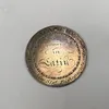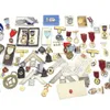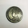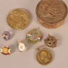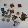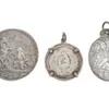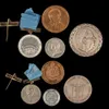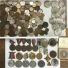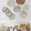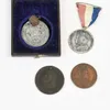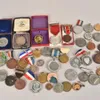 Small box of mixed coins inc. enamelled 1821 Crown, Halmarked 1914 St. John Pendant to John Thomas, Paris Exhibition 1855 Bronze Medal (one sided), French silver 1834 5f Coin (mounted) 1951 Festival o…