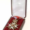 A WW1 Ottoman Empire Turkish Gallipoli Star. Silvered brass with vitreous enamel infill to the front. Usual pin and clasp assembly to the reverse side, with the makers mark being for the German compan…