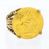 A George V half sovereign dated 1914 mounted in 9ct gold fancy ring mount with leaf decoration, size L1/2, weight approx 10.5gms . Further details: minor wear commensurate with age