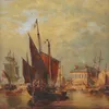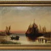 Attributed to Edward William Cooke ( English 1811-1880) Tender and fishing boats moored at the mouth of an estuary at dusk. Oil on canvas. 44 x 60cm