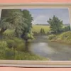 A George R Waterfield oil painting titled "On the Teme at Burrington" in frame. A Richard Blavey oil painting of Country scene, and a framed and glazed hand tinted caricature of a Child catching a Bir…