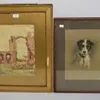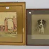 An early 20th Century water colour of church ruins by Herbert Nevell along with a chalk and charcoal drawing of a terrier.