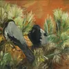 Scandinavian School (20th Century) Magpies perched amongst pine needles oil on linen, 26 x 33cm signed Hermonsson lower right, framed