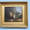 J Thomas (19th century, British School); Happy Days, children picking blossom from a bush; oil on canvas; label verso; 30cm x 36cm (framed)