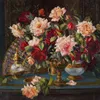 JOAN ROCKINGHAM (BRITISH, 20TH/21ST CENTURY) — Still life of roses with a fan with artist's label (to backboard) oil on canvas-board 45 x 55cm ARR
