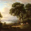 Figures and cattle in a woodland clearing with a view of the Clyde and Dumbarton in the distance