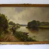 John Henry Boel aka Francis Jameson (British 1884-1922) oil on canvas of a gent strolling by a river with dog, signed l r, some small losses, 40 x 60cm, in worn wood and gesso frame