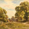 JOSEPH POWELL (BRITISH, 1876-1981) (2) — Country lane by a stream signed 'JOSEPH POWELL' (lower right) watercolour 38 x 56.5cm together with Cornstooks with a farm beyond, a watercolour by the same ha…