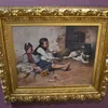An early to mid 20th Century oil on canvas of two continental children feeding geese in farmyard, signed Peske Geza top left hand corner, within giltwood plaster frame, 80cm x 65cm.