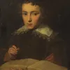 Portrait of a young boy in a brown coat and lace collar drawing in a sketch book