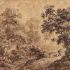 A wooded landscape with a traveller and his dog on a country path