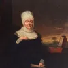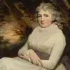 Portrait of Lady MacGregor Murray, wearing a lace bonnet, sitting in a landscape with her workbox