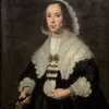 Portrait of lady in a black satin dress, half-length, wearing a headdress, wide lace collar, pearls and holding a fan