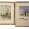A framed watercolour of sheep in a wintery landscape by Susan Mitchell. 61cm x 69cm frame inclusive. A framed pastel landscape of a house amongst trees by D.J.Goostrey. 56cm x 71cm frame inclusive