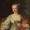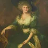 Portrait of a lady, half-length, in a white satin dress, holding a bunch of grapes
