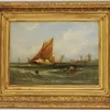 WILLIAM CALLCOTT KNELL (BRITISH, 1830-1880) Seascape with Hay Barge and Distant Mills signed and dated 1876 (lower left), oil on board 21 x 29cm (8.25in x 11.5in) Condition - good general condition