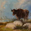 William Sydney Cooper (British, 1854-1927) Sheep and Cow by river, church beyond oil on panel, 40 x 51cm, label verso, gilt framed