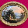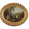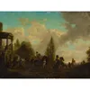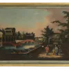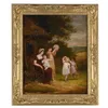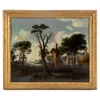 18th Century Italian School Figures resting amongst mature trees, further figures, lake and dwellings beyond in a mountainous landscape. Oil on canvas. 75 x 100cm. Stiff leaf moulded gilt gesso frame