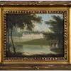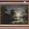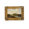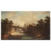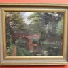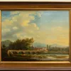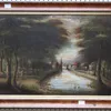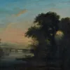 An English School oil on canvas painting of a waterside scene with bridge (area of damage to canvas on the bridge), in frame, unsigned.