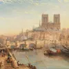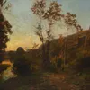 19th Century Continental School A riverside town at dusk with figures looking on. Oil on relined canvas, framed, 34 x 50cm