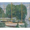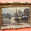 Early to mid 20th Century, English School, oil on canvas, of boats docked by the Thames, signed bottom right of the canvas, framed within gilt/plaster wooden frame, 59cm x 39cm.