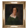 French School (early 19th century), portrait of a seated lady with ocean beyond, oil on canvas, monogrammed lower right, 45.5cm x 36.5cm, framed.