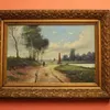 A framed oil on canvas, possibly Dutch, of a gentleman walking along a track with sailing boat and windmills in the background. Signed