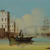Late 19th century, Watermen transferring to ship in harbour, oil on board, 14.5cm x 22cm frame