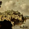 An extensive river landscape of a hillside town, with fishermen and boats in the foreground