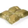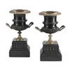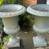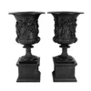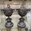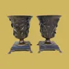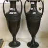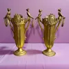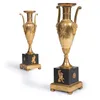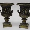 A PAIR OF NEOCLASSICAL GILT METAL VASES each of elongated form with circular spreading foot and ornate handles modelled as seated female figures holding draped swags. The rims with pierced Greek key m…