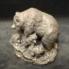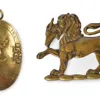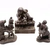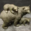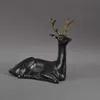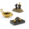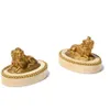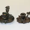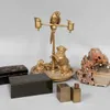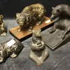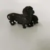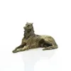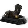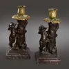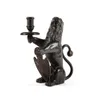 A Bronze weighted recumbent Lion 7cm long, and a pair of classical style Candlesticks 15cm high (3).