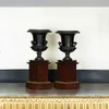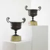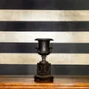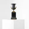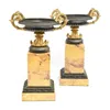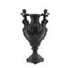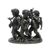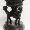 A FRENCH PATINATED COMPOSITE CHERUB TABLE CENTREPIECE ON MARBLE BASE the three cherub supporting the central classical urn, on a round marble base, 21cm diameter and 32cm high.