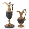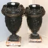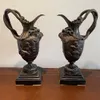 A pair of 19th century patinated bronze ewers, of baluster shape with circular feet, spout rim curved with masked design either side and medallion effect to end of curved handles, both upon attached b…