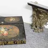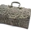 A 20th century bronze treasure chest shaped casket, with elaborate vines and foliate design, lock like hinged front and handle to top, unmarked. One hinge missing centre with wire replacement, general…