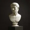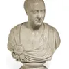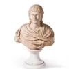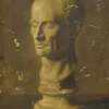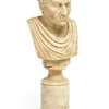 COMPOSITE STONE BUST OF JULIUS CAESAR modelled in classical style with characteristic short, curled hair and draped cloak over one shoulder. The bust is mounted on a square plinth with decorative moul…