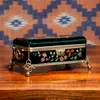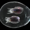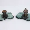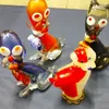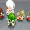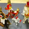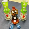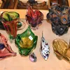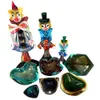 Murano Glass; two glass "dog" clown head ornaments each with green hats. One other seated "dog" clown, brown glass ornament with blue boots and collar.