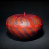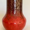 A Monart Art glass vase in red with brown speckling over a red ground. Tall cylindrical neck above a bulbous body. Raised pontil mark with one chip. Body and neck in good order with no chips or restor…