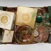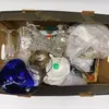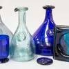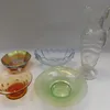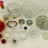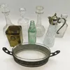 Collection of early to mid 20th century glass decanters, condiment bowl, tin and vintage pop bottle.