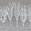 A suite of twelve Webb crystal facet bowl wine glasses, 11.5cm high. Together with four deep bowl wines, four large inverted bell wines, ten finger bowls, water jug, 20cm high and two cut glass champa…