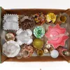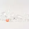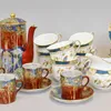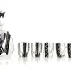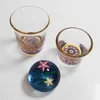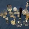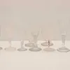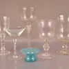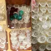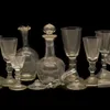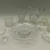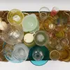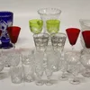 A collection of continental retro glass plates, bowls, glasses, shot glasses etc. chipping to some
