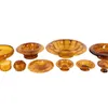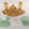 A collection of Mid 20th C glass dressing table / Vanity sets. A deco style pressed Amber glass Bagley set to include tray and night light holders Tray measures 19 cm x 30 cm A part set of 4 pink gl