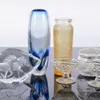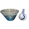 A glass bottle vase with blue and white swirl pattern and pontil mark, height 15cm together with a deep glass bowl, diameter 21.5cm. (2)